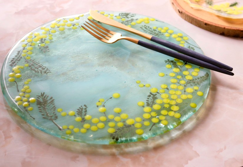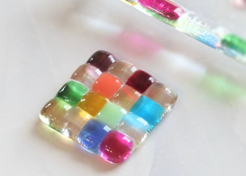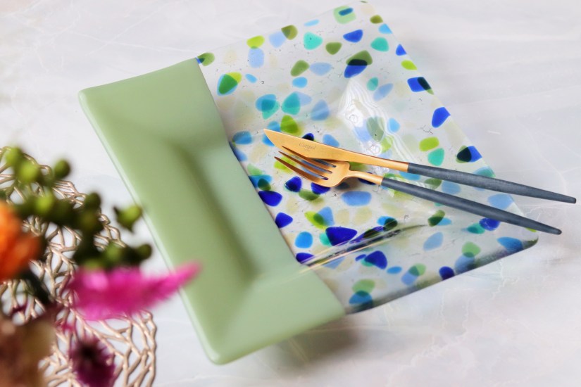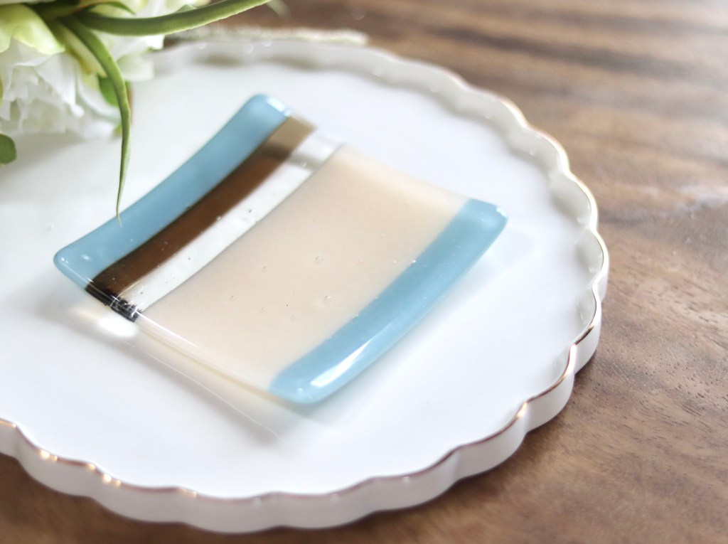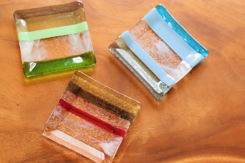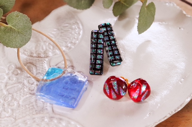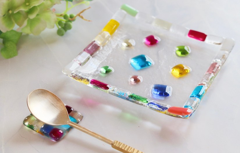 板ガラスを熔かして作るガラスフュージングは、自宅で本格的なガラス作品を作ることができるガラス工芸の一つです。板ガラスの表面にガラスカッターで傷をつけてガラスを割り、それを数枚重ね合わせたものを電気炉で焼成。アクセサリーや箸置き、お皿などが作れます。