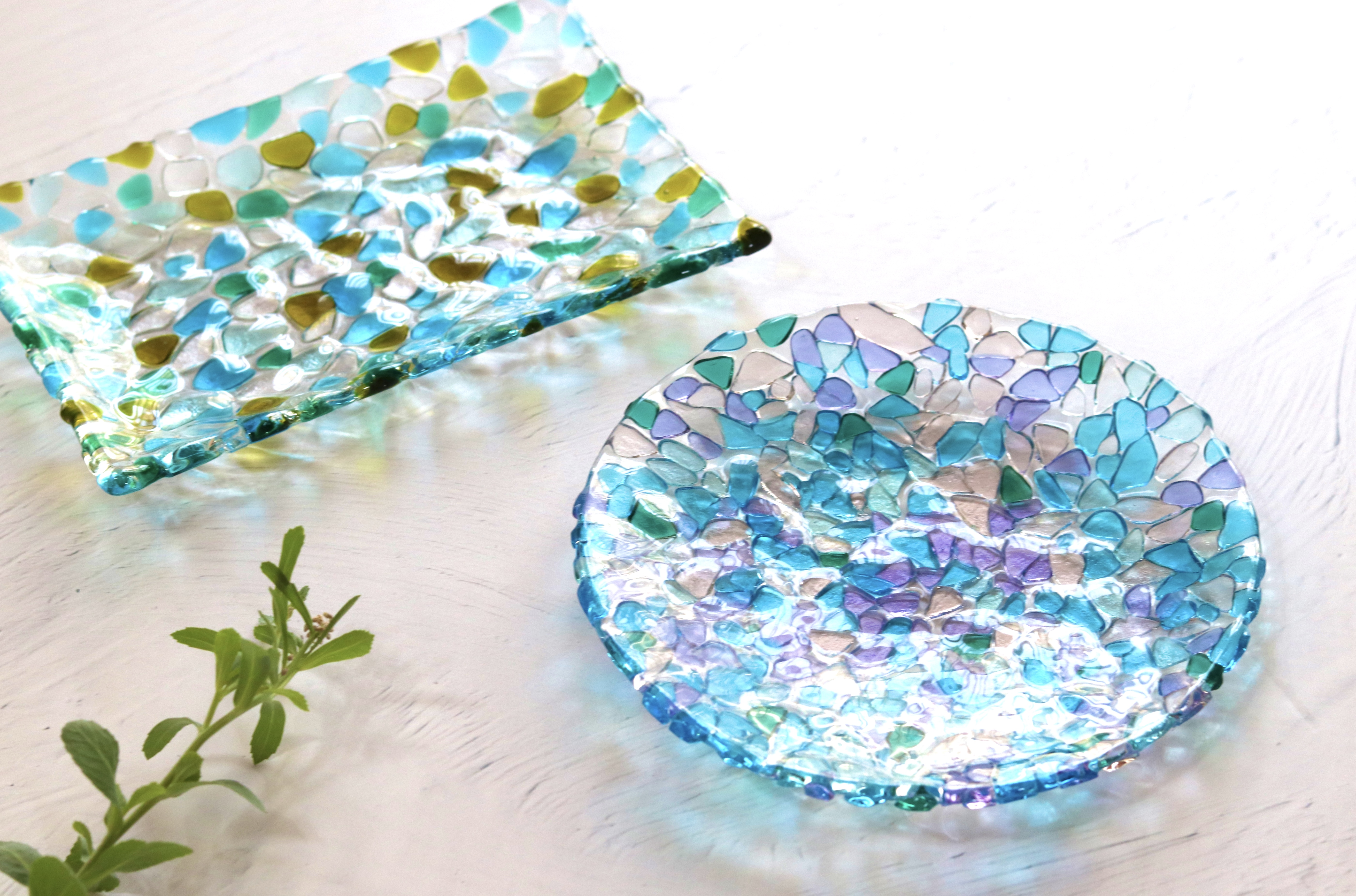 お皿やアクセサリー・時計など、作りたい作品を自由に制作できるフリーレッスン。プライベートレッスンのため、デザイン提案から制作まで丁寧にサポートします。100色以上のガラスから選んでいたけるTOM GLASS人気のレッスン。午前午後と続けてレッスンされる場合は軽食休憩(30分)ができます。